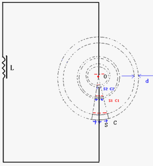如圖3,在一個由“點電極”O(jiān)與“球冠電極”S組成的“球錐空間”中,如果O與S之間產(chǎn)生了足夠的“特高電壓”,那么這個“球錐空間”就可以被“雙向激擊”,依次連續(xù)發(fā)生“球冠振蕩”……、S2、……、S1、……、S,產(chǎn)生不同頻率的“電磁波”,并且呈“嵌套球狀”分布,由外到里即由球冠S到點O,產(chǎn)生的“電磁波”的頻率越來越大。由外向里,由球面向球心,產(chǎn)生的電磁波的頻率可以從“可見波”頻率,逐漸增大,有的可以達(dá)到紫外線頻率、X射線頻率,甚至出現(xiàn)伽馬射線頻率。[3][4]