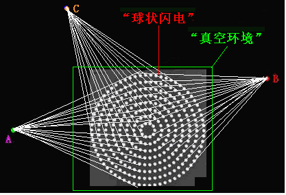如圖12,A、B、C等處的光源發(fā)出的光線,在通過“球狀閃電”時,都在“球狀閃電”中的“光子流體能量負(fù)壓”的作用下,被“吸入”“留住”作“圓周運(yùn)動”,而不能穿過“球狀閃電”,光源對面的觀察者將不能看到這個光源發(fā)出的光線——呈現(xiàn)“黑洞效應(yīng)”。