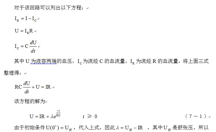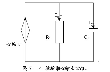 下圖是心臟收縮期回路簡單模擬,血管的狀態(tài)用R和C簡單并聯(lián)表示。由于血管各處都存在液容,實際的情況可能很復(fù)雜,但用簡單參數(shù)分析,也同樣能反映血液循環(huán)的一些特性。為了分析的方便,將心臟射血輸出量近似為恒流源。