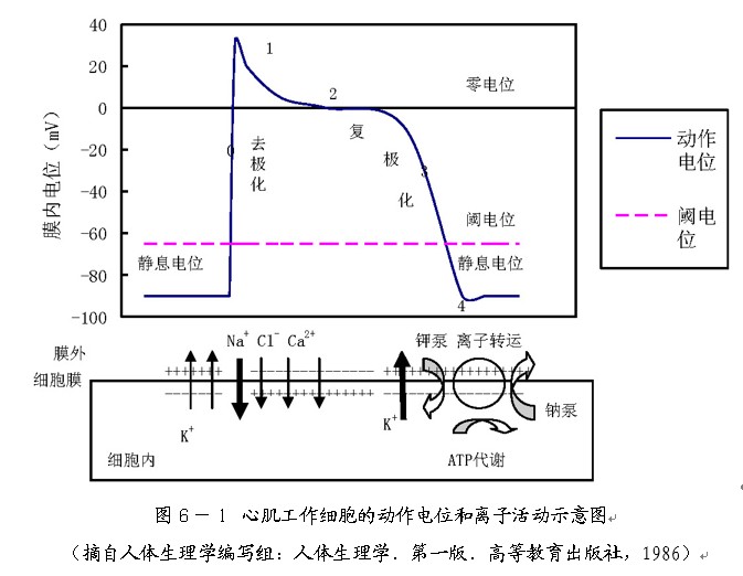 在上圖中,去極化(0期),心肌細(xì)胞受刺激后,靜息電位到達(dá)閾電位時(shí),迅速激活鈉通道,使其開(kāi)放,造成大量鈉離子內(nèi)流,動(dòng)作電位迅速升高,鈉通道又迅速失活關(guān)閉;快速?gòu)?fù)極化初期(1期),鈉離子內(nèi)流停止,氯離子通透性升高,氯離子內(nèi)流,氯離子通道通透性也迅速下降;緩慢復(fù)極化期(2期),鈣離子緩慢內(nèi)流,與此同時(shí),少量鉀離子外流,鈣離子通道的激活和失活過(guò)程均緩慢,故稱(chēng)慢通道;快速?gòu)?fù)極化末期(3期),鉀離子外流;靜息期(4期),此期離子轉(zhuǎn)運(yùn)活躍,即把動(dòng)作電位形成期間流入膜內(nèi)的鈉離子,氯離子,鈣離子排出,又把外流的鉀離子攝回,這一過(guò)程通過(guò)心肌細(xì)胞膜上的Na+-K+泵的作用完成的,需要消耗ATP的生理過(guò)程。(本小節(jié)內(nèi)容摘自人體生理學(xué)編寫(xiě)組:人體生理學(xué).第一版.高等教育出版社,1986)