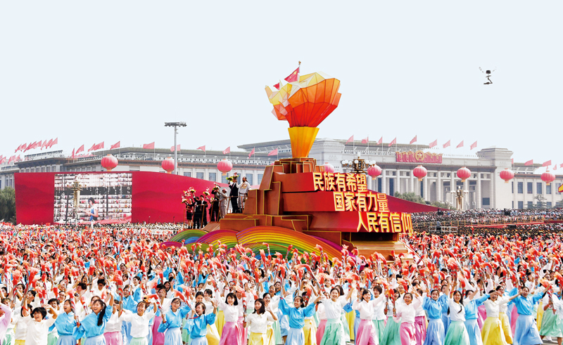 2019年10月1日,慶祝中華人民共和國成立70周年大會(huì)在北京天安門廣場隆重舉行。這是群眾游行中的“凝心鑄魂”方陣。 新華社記者 李欣/攝